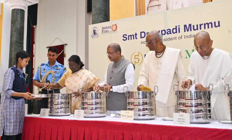 देश के सबसे बड़े स्कूल पोषण अभियानों में शामिल अक्षय पात्र फाउंडेशन ने एक ऐतिहासिक उपलब्धि हासिल करते हुए 5 अरबवीं थाली परोसने का जश्न राष्ट्रपति भवन सांस्कृतिक केंद्र में मनाया। इस खास मौके पर भारत की राष्ट्रपति द्रौपदी मुर्मू ने स्वयं बच्चों को भोजन परोसकर इस उपलब्धि को यादगार बना दिया। कार्यक्रम में केंद्रीय शिक्षा मंत्री धर्मेंद्र प्रधान, इस्कॉन बेंगलुरु के अध्यक्ष और फाउंडेशन के संस्थापक चेयरमैन मधु पंडित दास तथा वाइस चेयरमैन चंचलापति दास सहित कई गणमान्य लोग मौजूद रहे।