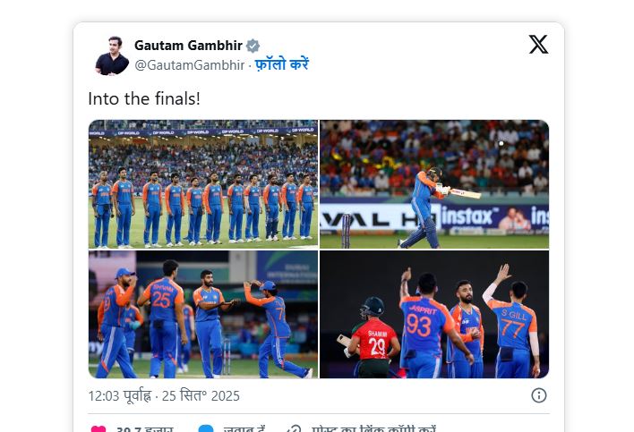 Asia Cup के Final में पहुंचा इंडिया, Gambhir का 3 शब्दों वाला पोस्ट VIRAL