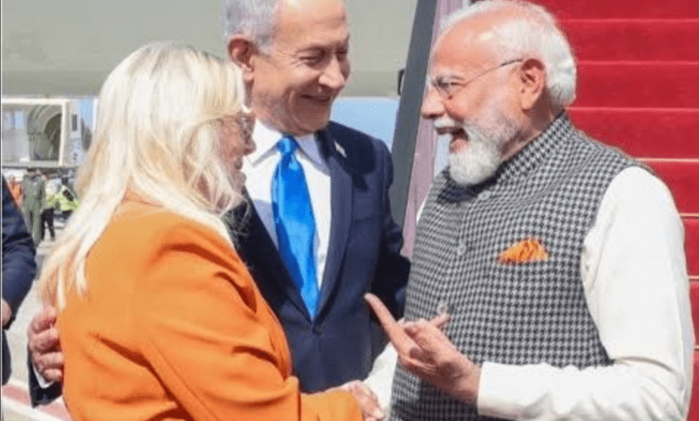 PM Modi Israel Visit: प्रधानमंत्री नरेंद्र मोदी के इजरायल दौरे के दौरान एक खास पल सोशल मीडिया पर चर्चा का विषय बन गया। Benjamin Netanyahu और उनकी पत्नी Sara Netanyahu ने तेल अवीव के बेन गुरियन एयरपोर्ट पर पीएम मोदी का गर्मजोशी से स्वागत किया। इस दौरान नेतन्याहू का भारतीय पोशाक पहनना और सारा की ड्रेस का पीएम मोदी के केसरिया रूमाल से मैच होना लोगों का ध्यान खींच गया।