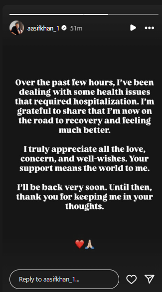 दूसरे स्टोरी शेयर करते हुए आसिफ खान ने अपना हेल्थ अपडेट दिया है. उन्होंने बताया है कि अब उनकी तबीयत पहले से बेहतर है और वो रिकवर कर रहे हैं. आसिफ ने लिखा- ‘पिछले कुछ घंटों में मेरी तबीयत कुछ ठीक नहीं थी और मुझे अस्पताल में भर्ती होना पड़ा. अब ये बताते हुए खुशी हो रही है कि मैं ठीक हो रहा हूं और पहले से काफी बेहतर महसूस कर रहा हूं. आप सभी का प्यार, चिंता और शुभकामनाओं के लिए दिल से शुक्रिया. आपका साथ मेरे लिए बहुत मायने रखता है. मैं बहुत जल्द लौटूंगा. तब तक मुझे अपनी दुआओं और यादों में रखने के लिए थैंक्यू.’