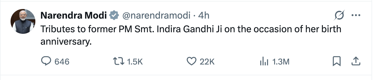 “पूर्व प्रधानमंत्री इंदिरा गांधी को उनकी जयंती पर श्रद्धांजलि।”